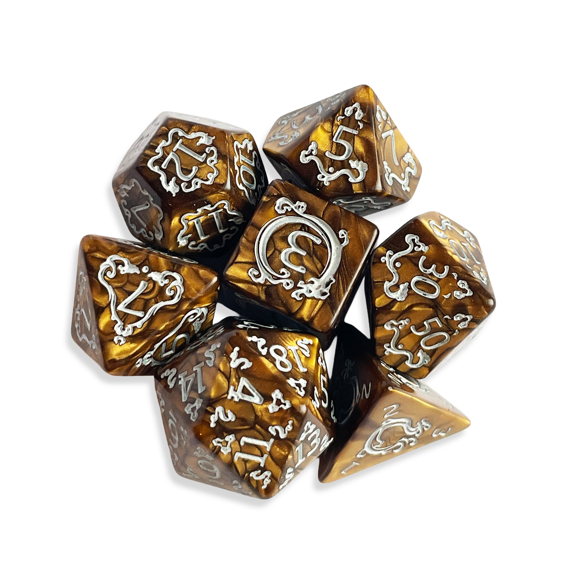 This pearlescent D&D dice set features a subtle shimmering finish that catches the light with every roll. The elegant glow gives these polyhedral dice a refined and magical appearance, perfect for Dungeons & Dragons and tabletop RPGs. Designed for collectors and players alike, this set combines visual appeal with reliable performance at the game table.